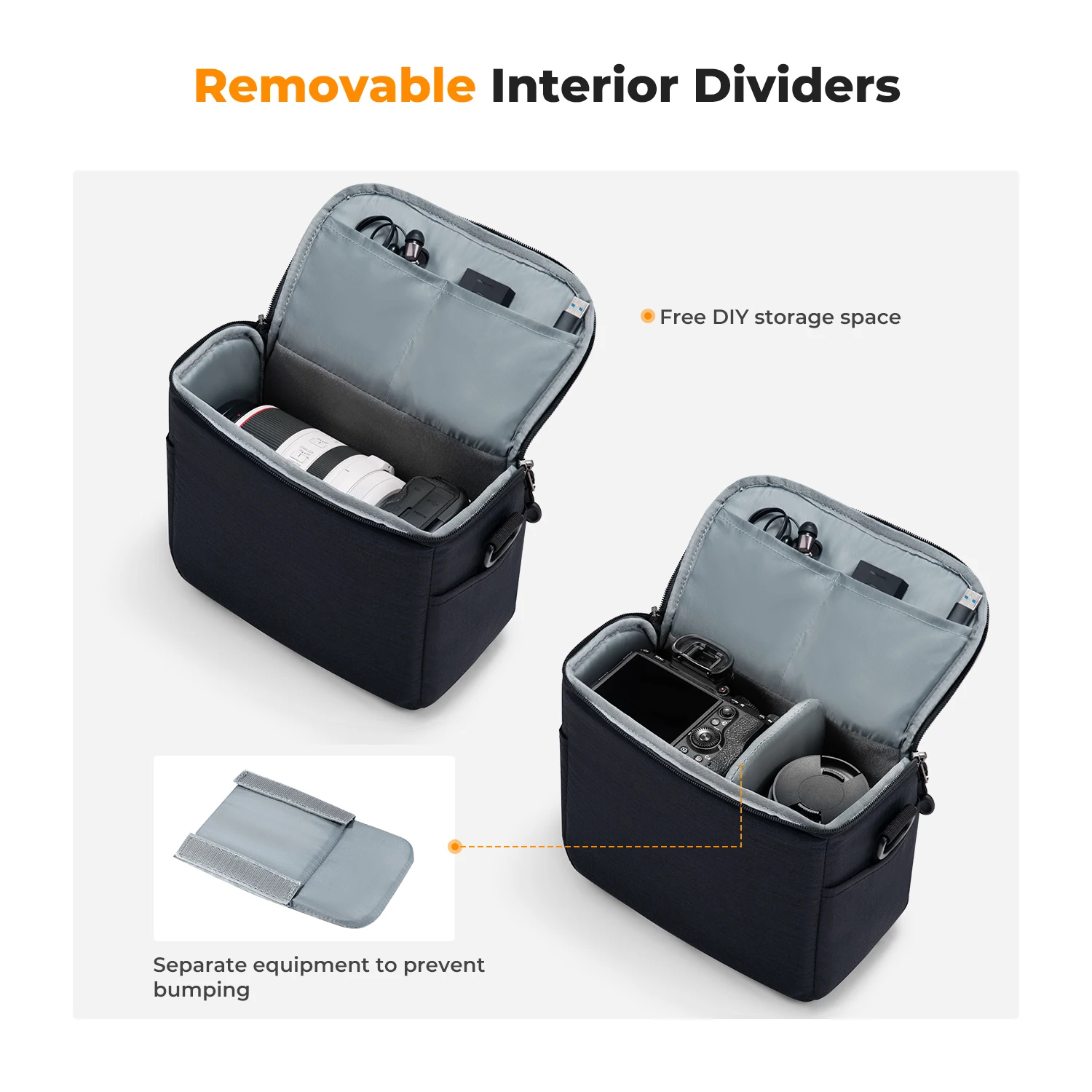 This crossbody camera bag comes with 1 removable padded divider to for personalized storage. keep camera and others separated and protected, also enable you to customize main compartment for different size of camera equipment. After removing inner dividers, it can easily convert it from a dslr camera bag into a stylish everyday shoulder bag.